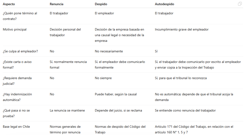 - Autodespido: el trabajador pone término al contrato, pero porque acusa una falta grave del empleador.